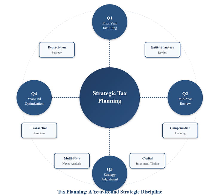 Tax implications should inform major business decisions—entity structure, geographic expansion, acquisition strategy, capital allocation. When tax planning happens in isolation from strategic planning, you miss optimization opportunities.