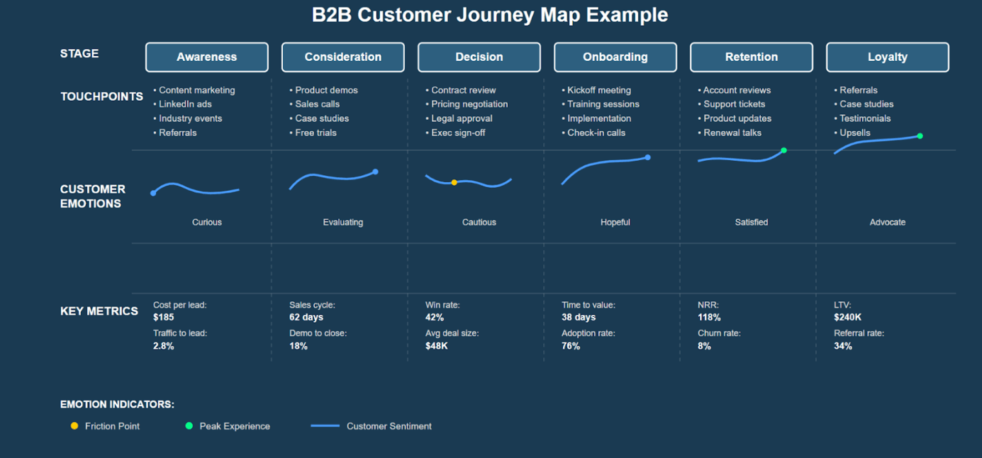 B2B customer journey maps differ from consumer maps in complexity, cycle length, and stakeholder involvement. Here's what effective B2B journey mapping looks like in practice: