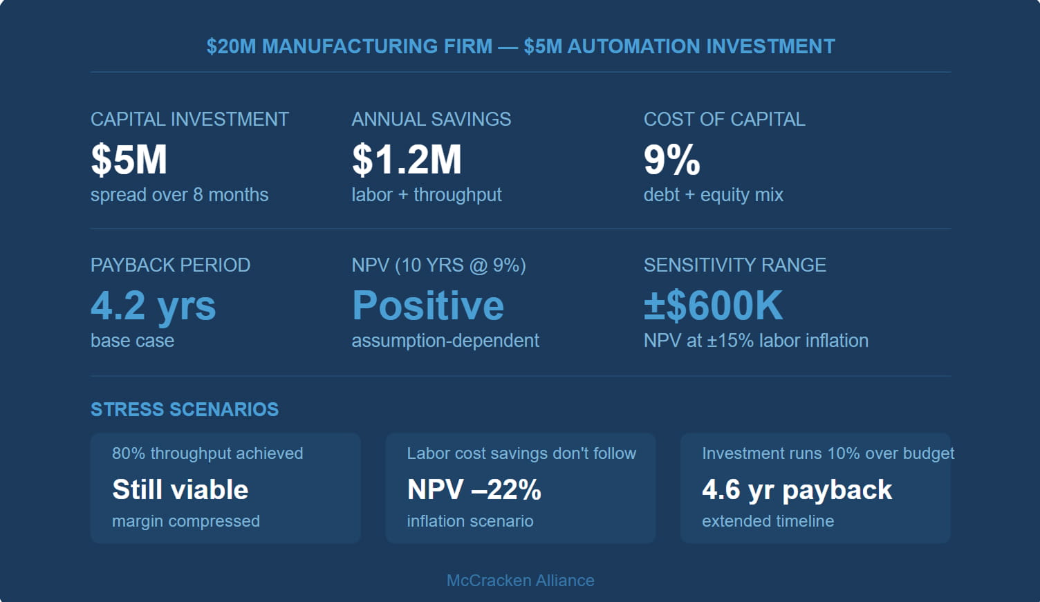 Let's say we have a $20 million manufacturing firm that is considering investing $5 million in automation. The rationale is to save labor, improve throughput, and free up labor to improve other areas of the manufacturing process. Sounds great, right? But let's get to the numbers and see if the analysis justifies the investment.